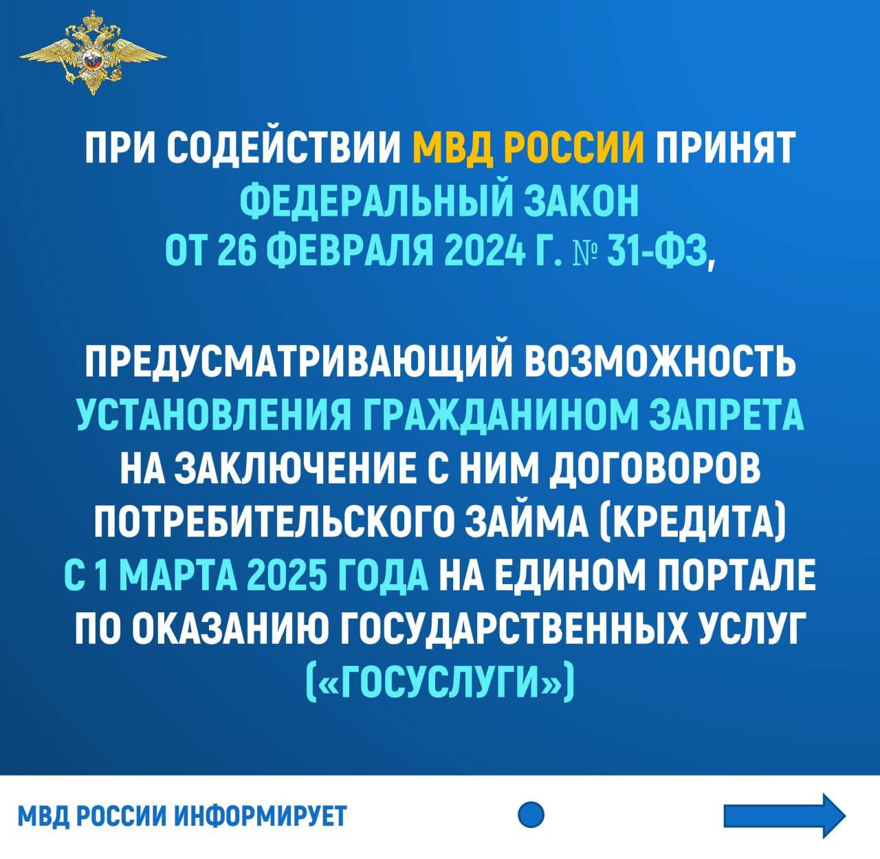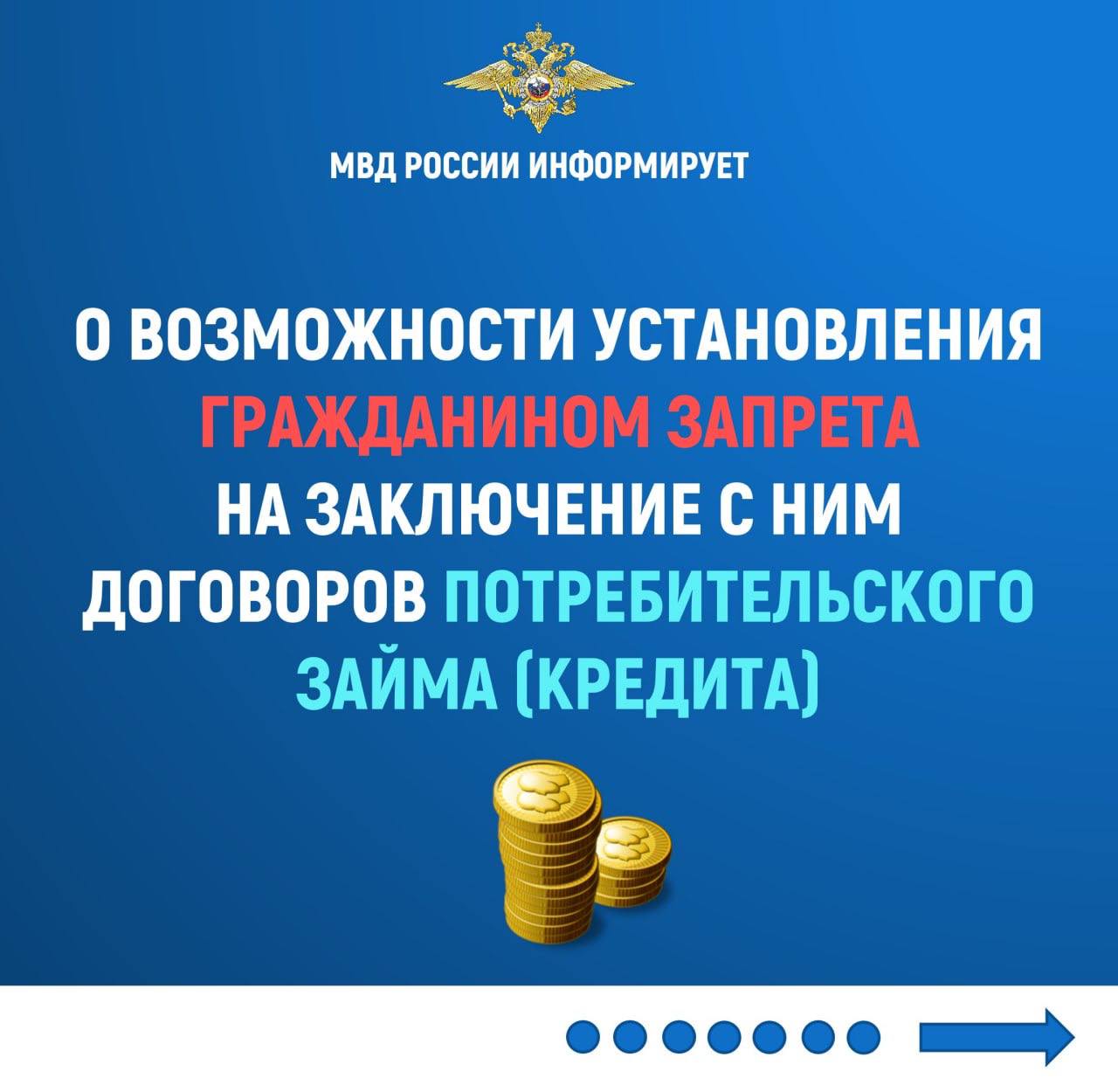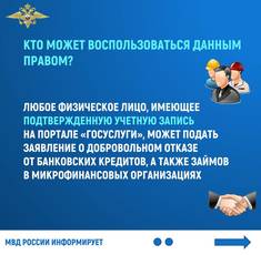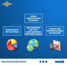 Отдел МВД России по Рузскому городскому округу напоминает, что с 1 марта пользователи портала государственных услуг www.gosuslugi.ru могут самостоятельно установить запрет на выдачу им кредитов в банках. Это очень важно, поскольку исключает для мошенников возможность оформить кредит на имя человека, паспортные данные которого стали им известны.