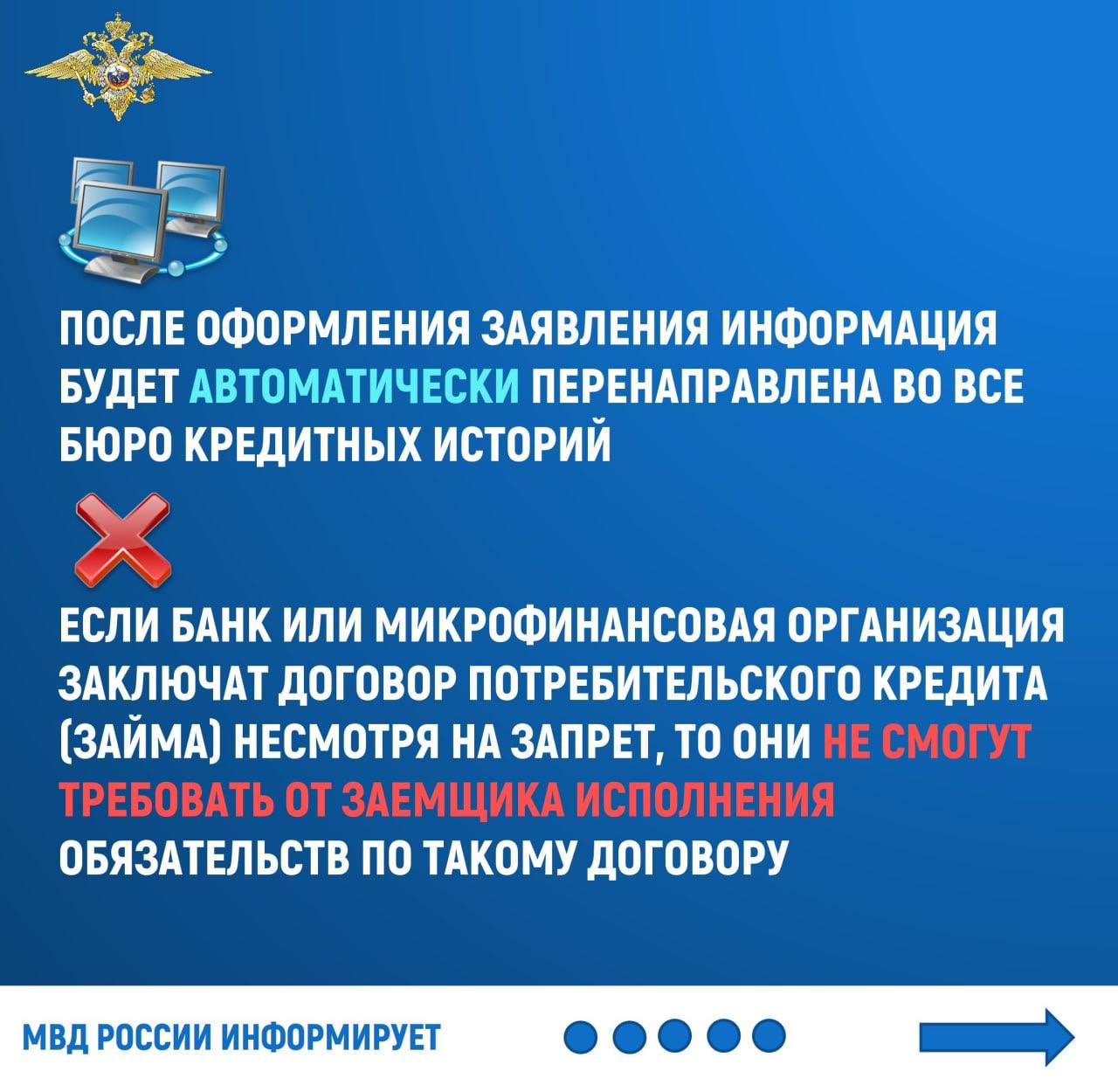 После оформления заявления на портале государственных услуг информация будет автоматически перенаправлена во все бюро кредитных историй. Если банк при установленном самозапрете всё же оформит на вас кредит, то не сможет требовать исполнения обязательств по такому договору.
