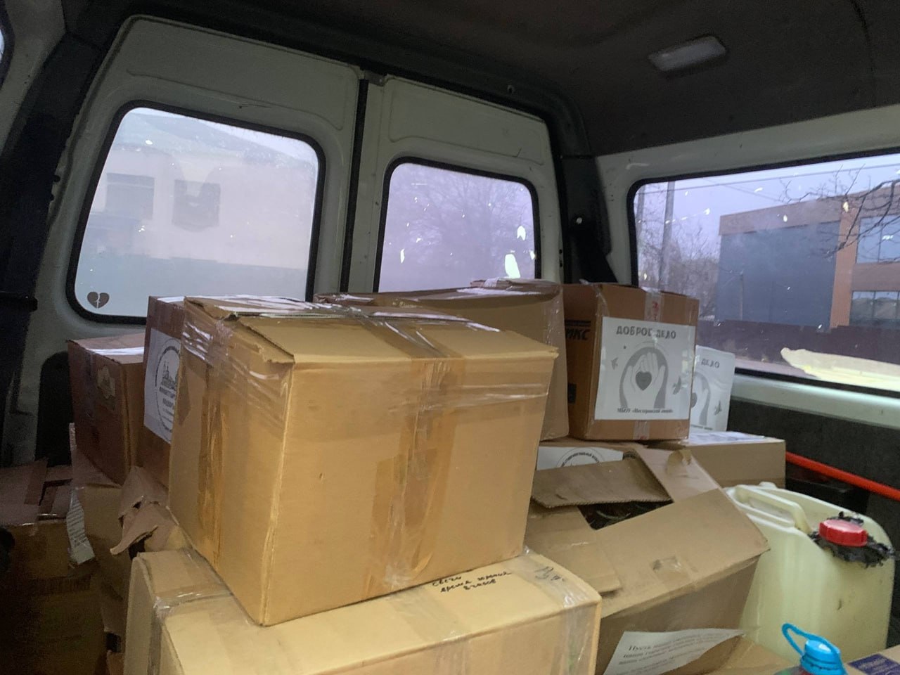 В распределительный центр уехали десятки килограммов продуктов питания, средства личной гигиены, теплые вещи, медикаменты и письма со словами поддержки от учащихся школ округа и волонтеров.